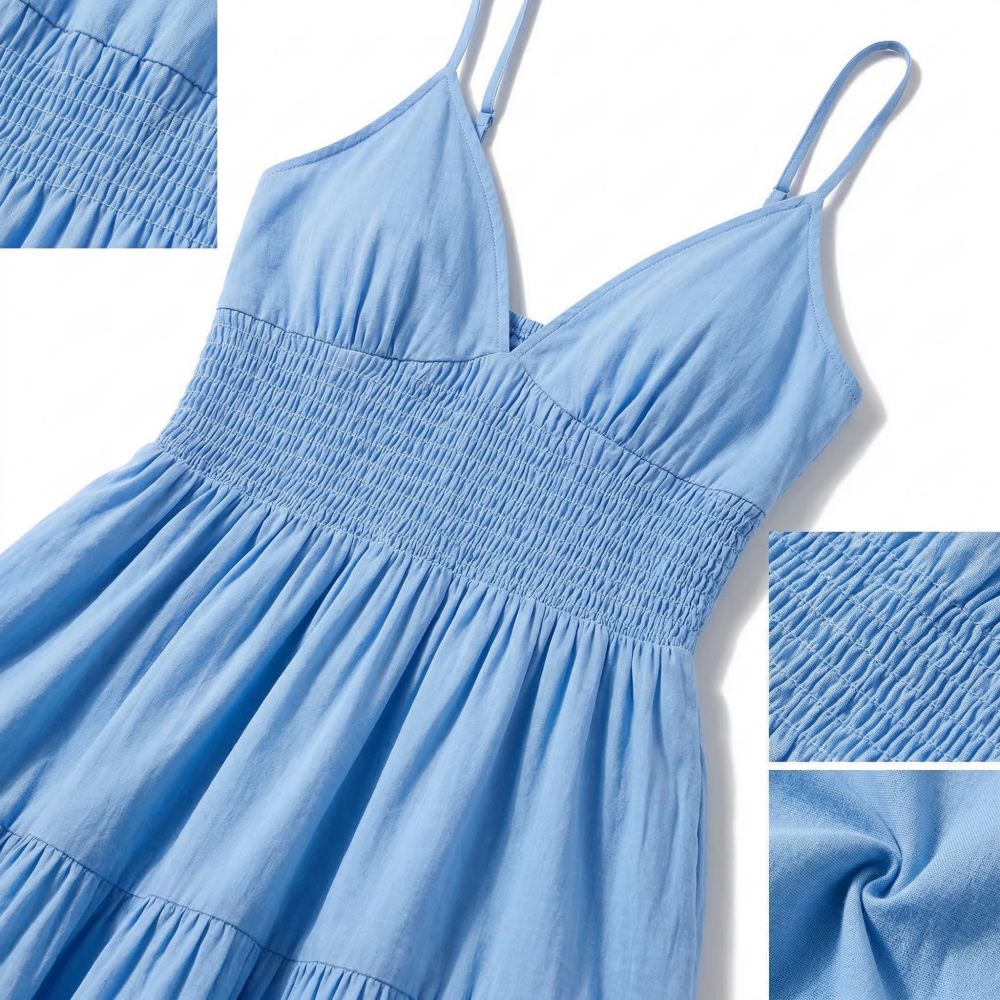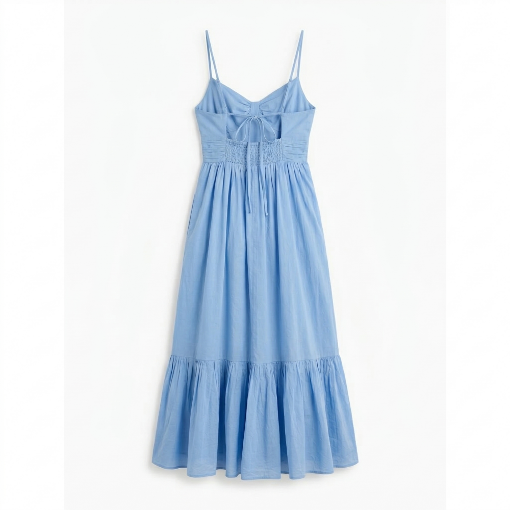 Factory Custom Light Blue Ruched Waist Ruffle Hem Maxi Dress